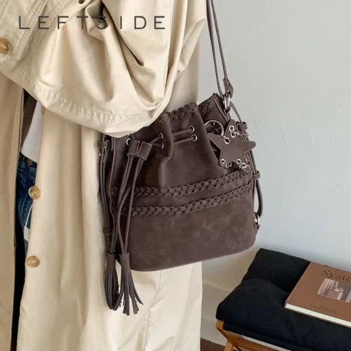 LEFTSIDE Vintage Small Faux Suede Shoulder Bags for Women Bucket Crossbody Bag 2025 Winter Luxury Designer New Trend Handbags